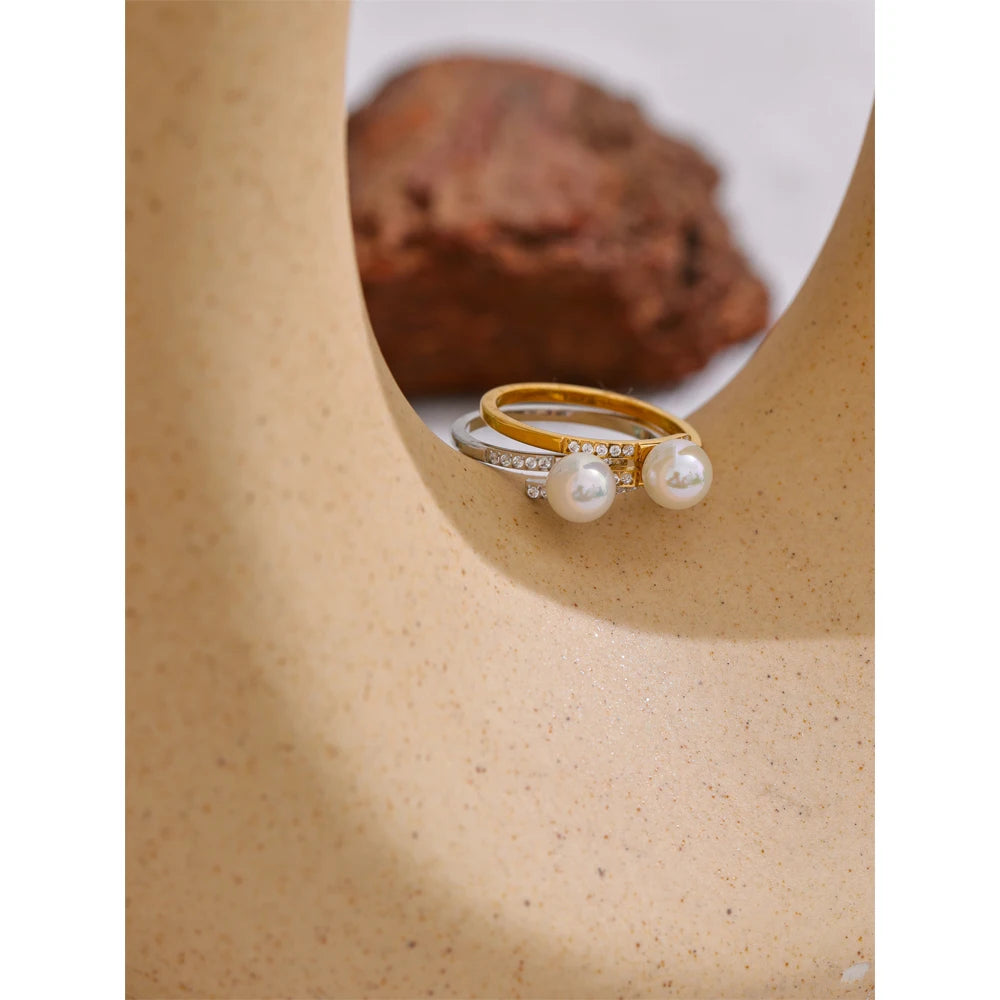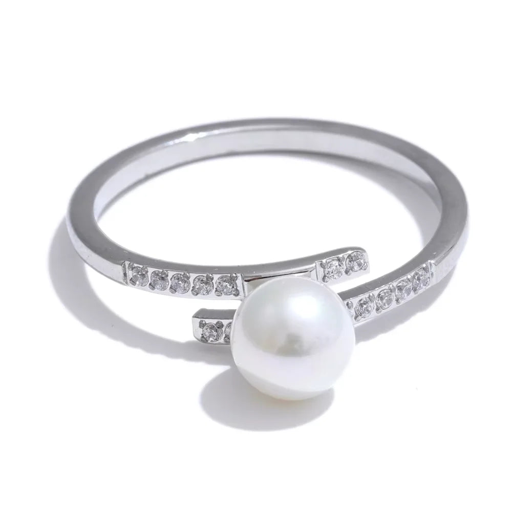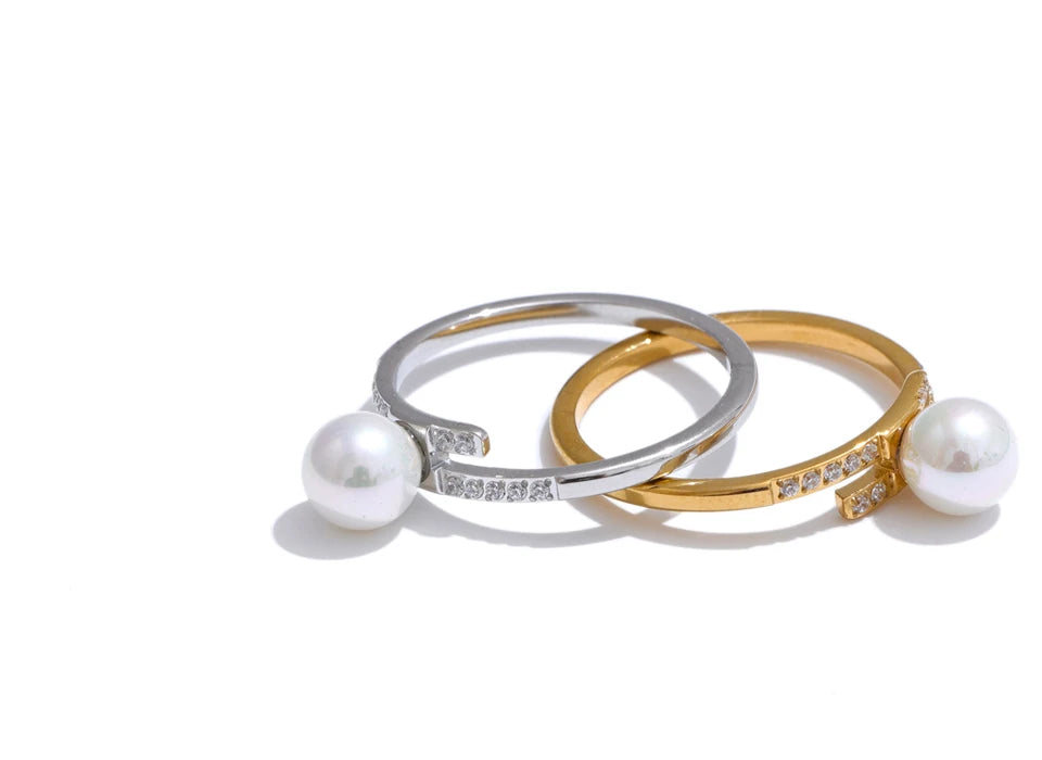 טבעת עדינה בעיצוב אלגנטי בסגנון קוריאני עם פנינה דקורטיבית וזירקוניה נוצצת. שילוב של קווים נקיים וגימור יוקרתי בציפוי זהב ופלטינה יוצר תכשיט נשי, רך ומתוחכם לכל הופעה.