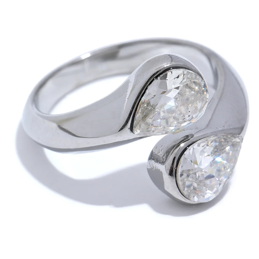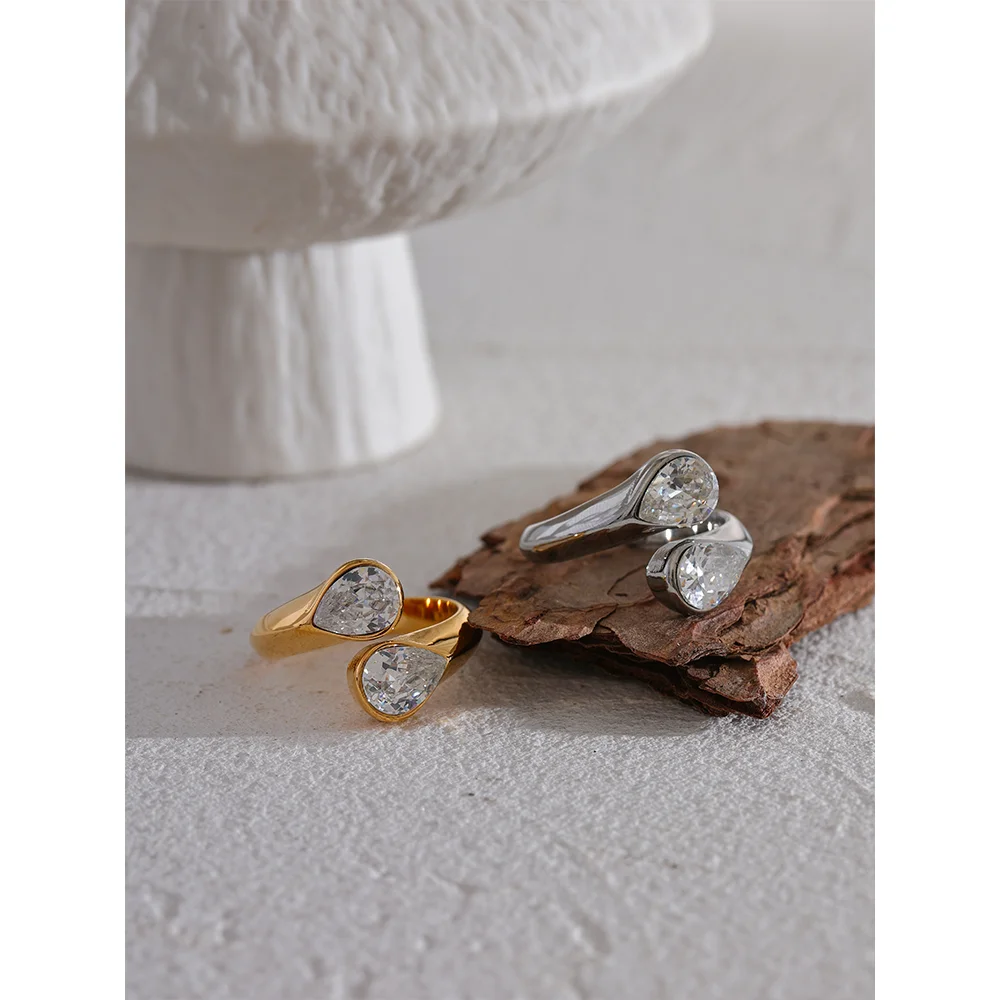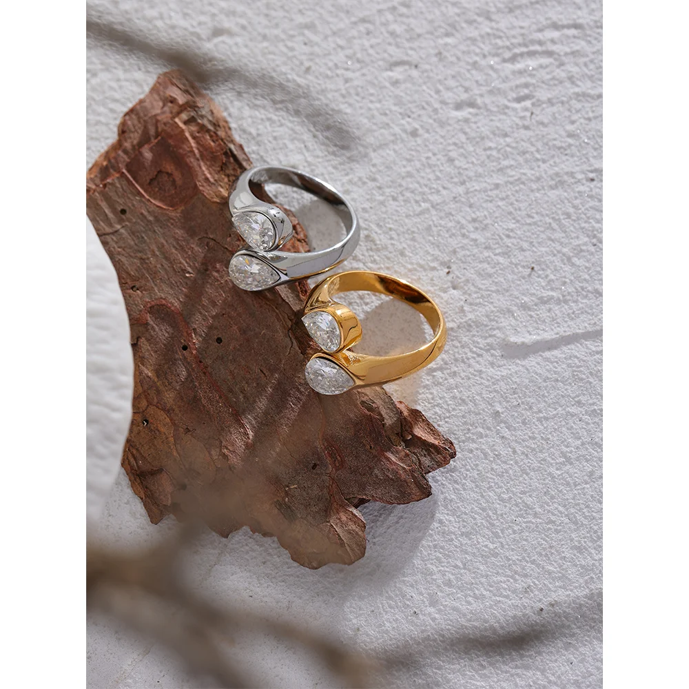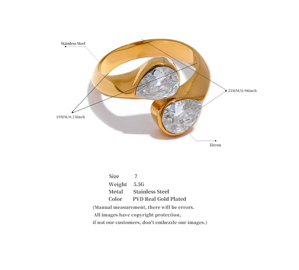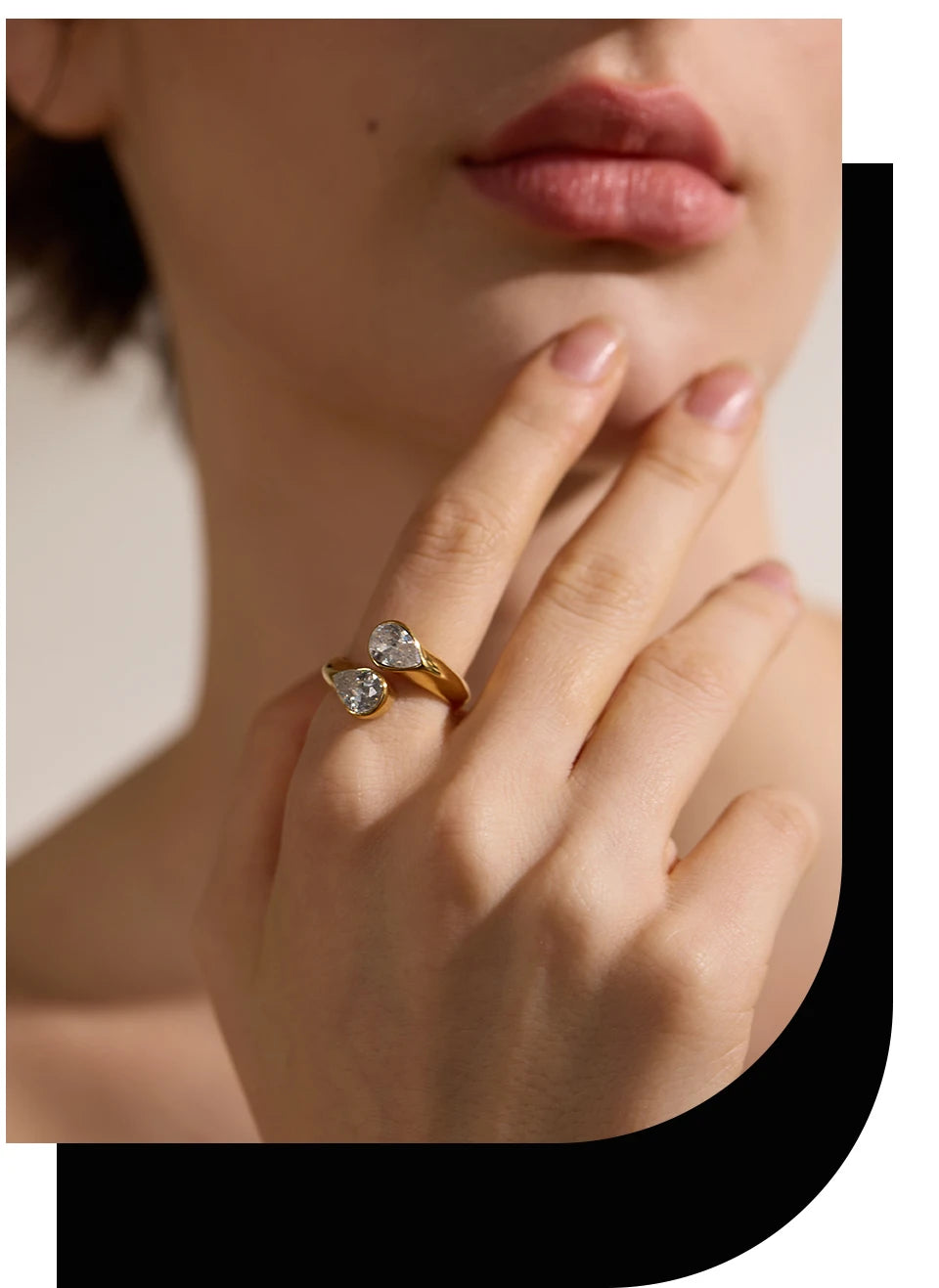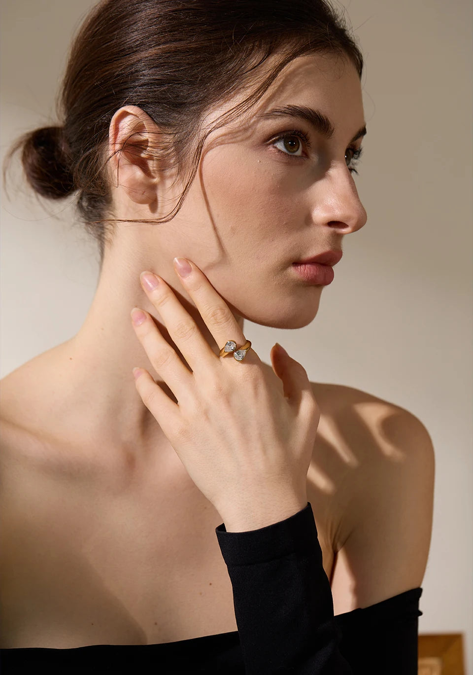טבעת יוקרתית בעיצוב גיאומטרי מודרני, משובצת זירקוניה AAA נוצצת עם טקסטורה אלגנטית וגימור זהב יוקרתי. תכשיט זוהר ובעל נוכחות שמעניק מראה מתוחכם ומושלם לאירועים מיוחדים.